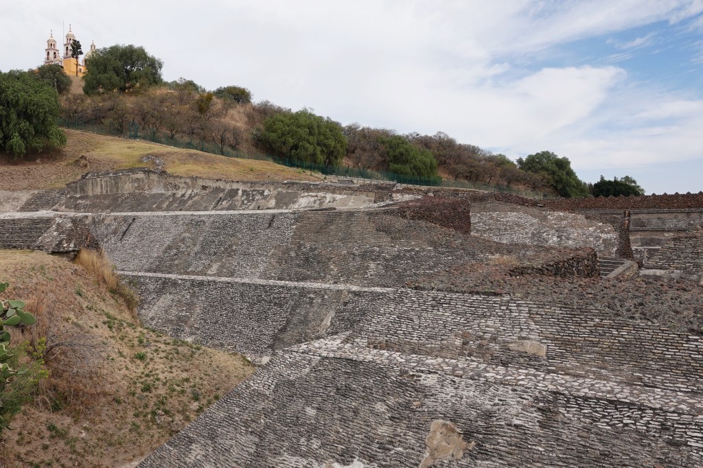 Pasé de largo puestitos de venta de chapulines comestibles y comencé la escalada agotadora. En la cumbre, desde la pequeña iglesia en las alturas, pude contemplar el conjunto del panorama e imaginar la tragedia sucedida en 1519, cuando soldados de Hernán Cortés aliados con fuerzas indígenas tlaxcaltecas, en camino a Tenochtitlán, masacraron sin piedad a la casi totalidad de los cholultecas (aliados por entonces de los mexicas), incluyendo a sus gobernantes y sacerdotes, y pusieron fin a una de las historias más destacadas y prolongadas del México Antiguo. En la zona arqueológica los investigadores, tras décadas de trabajo, han logrado hallar solo una parte menor de los tesoros escondidos debajo de los matorrales del cerro, intentando así revelar algunos de los secretos de las siete capas de Gran Pirámide, construidas durante siglos una sobre la otra.