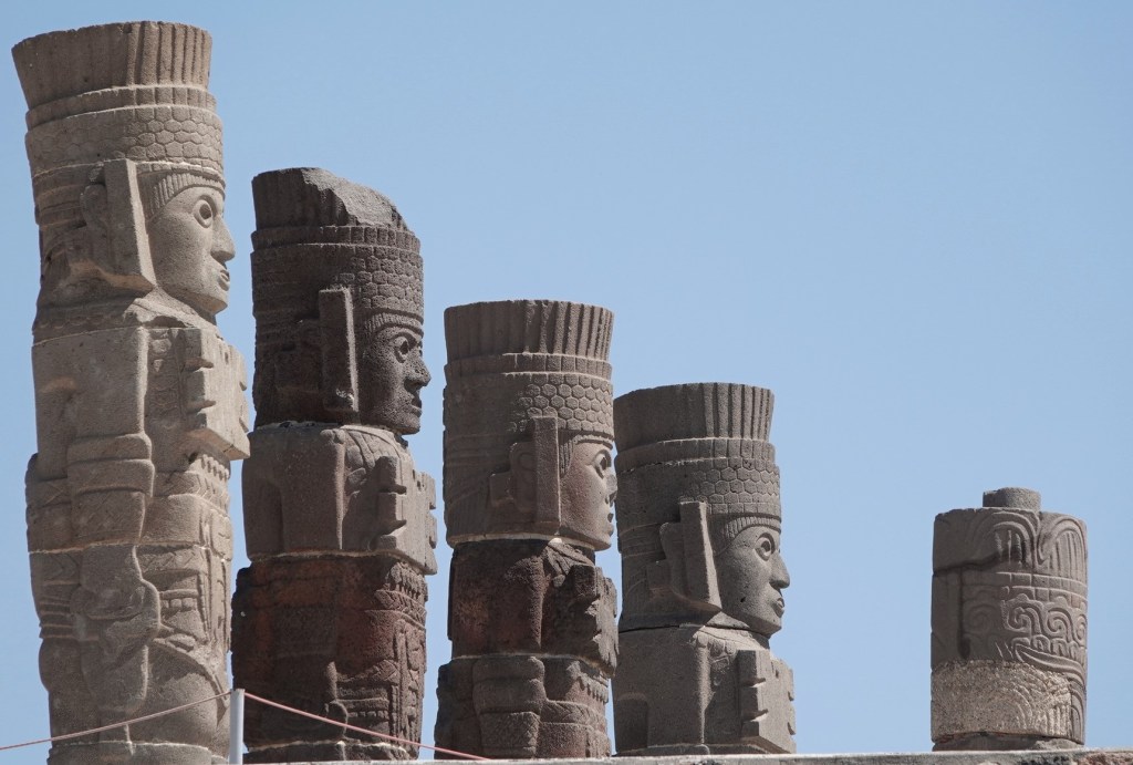 Más al norte, ya en el Estado de Hidalgo se encuentra Tula, donde erigieron su vida los toltecas, herederos de Teotihuacán, y antecesores de los aztecas. Sobre una de las pirámides del gran centro administrativo, religioso y político que rodea la plaza central junto a otra pirámide, un palacio, una cancha de juego de pelota y otros edificios, se yerguen -recordando quizás en la imaginación a los Moai de la Isla de Pascua- las cuatro enormes figuras antropomorfas conocidas como “Atlantes de Tula”. Desde la cima de la llamada “Pirámide B” ellos parecen aguardar, firmes, en posición lista para entrar en combate, el llamado de los antepasados de Teotihuacán o de los futuros emperadores de Tenochtitlán, ambos ubicados en ese Sur al que dirigen sus miradas.