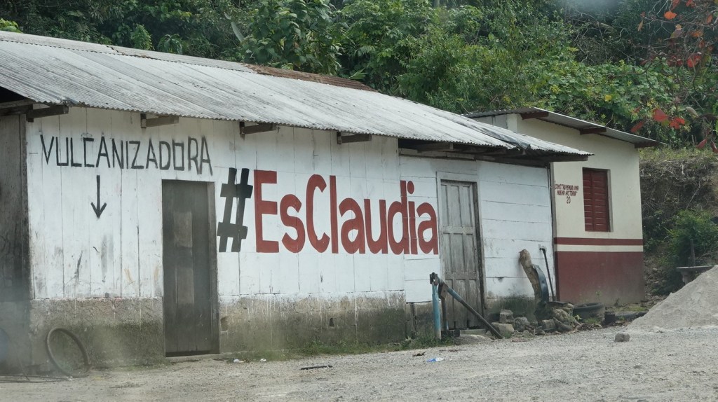Pintada electoral en favor de la candidata Claudia Sheinbaum entre los poblados mayas de la selva de Chiapas
