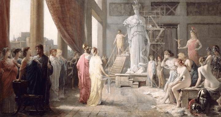 Pericles es mecenas protector de las artes y la literatura, en el tiempo del «padre de la historia» Heródoto, del sofista Protágoras, Sócrates, los trágicos Sófocles y Eurípides, o el otro gran arquitecto, además de Fidias, Hipodamo de Mileto; además, es discípulo de los filósofos Anaxágoras y de Zenón de Elea. Atenas así se envuelve en un halo de prestigio cultural. Protege a Fidias, el escultor de la Acrópolis de Atenas, y su Partenón, como templo dedicado a Palas Atenea, diosa guardiana de la ciudad, o de los Propileos. La ciudad así se embellece. Su arte es también obra pública que dispensa mucho trabajo.