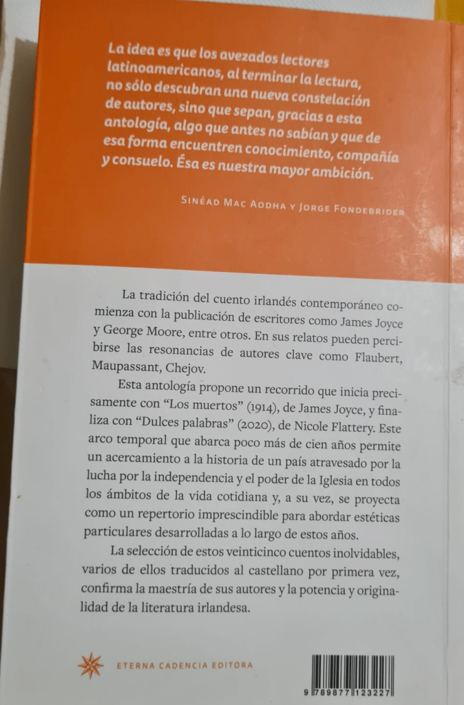 Y radiante es también la literatura irlandesa, en la que confluyen sus distintas corrientes: el realismo y costumbrismo, lo mágico y poético, lo vernáculo y nacionalista. La epopeya novelística de Joyce atrae como su sol más ardiente, pero parte de las ramas del árbol literario irlandés se mecen con especial vaivén en sus cuentos. Veinticinco de esas perlas literarias se enhebran en la antología Cuentos irlandeses contemporáneos (2024), publicado por la editorial Eterna Cadencia, en la Ciudad de Buenos Aires, con selección y prólogo de Sinéad Mac Aodha (directora ejecutiva de Literature Ireland, institución abocada a la promoción de la literatura irlandesa en el extranjero), y Jorge Fondebrider (poeta, ensayista, fundador y director del Club de Traductores Literarios de Buenos Aires); y con las traducciones de Matías Battistón, Andrés Ehrenhaus, Inés Garland, Jan de Jager, Pedro Serrano, y también el ya mencionado Jorge Fonderbrider.