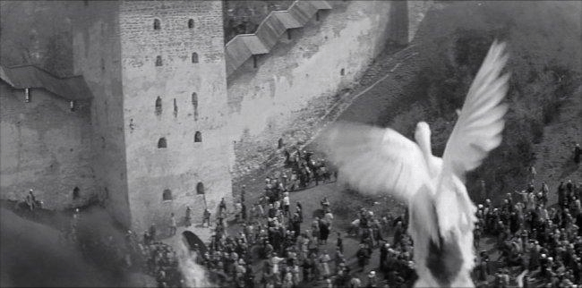 Asociado a lo intimista y lo que tiende a la lentitud e inmovilidad, Tarkovski pasa bien el examen de la filmación del movimiento de masas. Y acepta un elemento de improvisación en su planificación detallada de las tomas. Durante una imagen ascendente de la ciudad violentada, se arrojan unos patos, que le confieren un encanto poético y casi surrealista a la escena de brutalidad.
