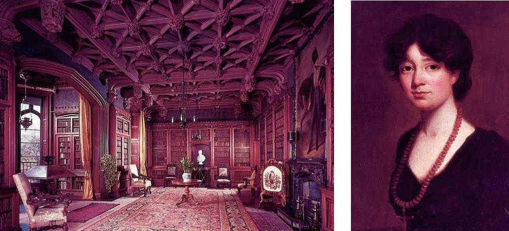 Pero Abbotsford seguía creciendo. En 1822 ya no quedaba casi nada de la construcción primitiva. Y, un año más tarde, ya estaba instalada la magnífica biblioteca, con los espléndidos artesonados de su techo, copiados de la Rosslyn Chapel. Los veinte mil volúmenes, dispuestos en ordenadas estanterías de madera, estaban marcados en caracteres dorados con la inscripción «Clausus tutus ero» (anagrama de Gualterus Scotus). Hay también un busto de Shakespeare, el cartapacio que llevaba Napoleón en Waterloo, un arpa, retratos familiares, unos cabellos del príncipe Charlie, la bolsa de Rob Roy y la misteriosa piedra contra el maleficio de las hadas, que el propio Walter llevó de pequeño, montada en plata. El escritorio donde trabajaba estaba fabricado con trozos de madera de los barcos de la Armada Invencible.