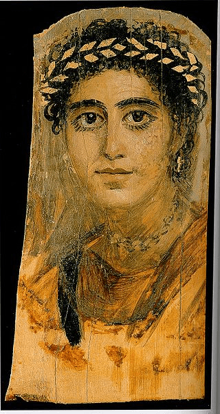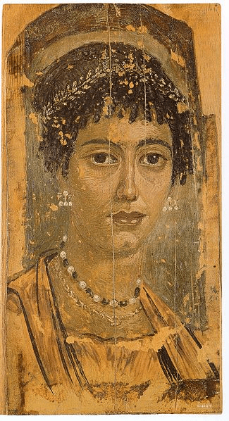 Retrato de El Fayum de un mujer de melancólica mirada, en madera de tilo encerado, encáustica, técnica de pintura que se caracteriza por el uso de la cera como aglutinante de los pigmentos, en Museo Británico (Wikimedia).