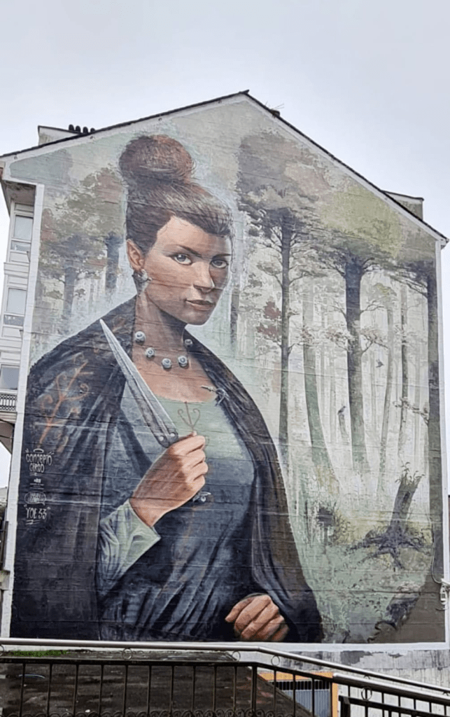 Pero junto a la muralla reposa también otro extraordinario mural: una hermosa castrexa, obra de Manuel Pallín, elegida como mejor mural del mundo en 2023 por la ya mencionada plataforma Street Art Cities. La cultura castrexa existió en el noroeste de la península Ibérica entre el siglo VI a. C y el siglo I d. C. Se distinguía por la construcción de poblados circulares fortificados llamados castros, y por una economía basaba en la agricultura, la ganadería, la pesca, la caza y la recolección, la metalurgia, el tejido y la elaboración de cerámica. Una cultura que se expandió por las regiones de Galicia, Asturias, norte y centro de Portugal y oeste de León.