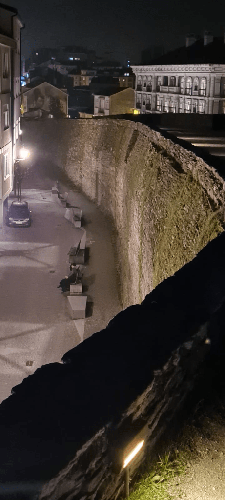 Y nos dirigimos hacia un lugar que ya no es muy conocido. Mientras accedemos a la muralla alzamos la vista hacia la bóveda celeste. Comprobamos que casi no hay nubes. Al caminar por la construcción romana sobreviviente, nos fascina cada presencia, cada ventana, cada calle, bañadas por magnéticas luces. Del techo a dos aguas de un largo edificio, una chimenea libera una humareda que se recorta sobre un trasfondo luminoso. Todo irradia variedad, y la impresión de algo íntimo y recién nacido. Nos reencontramos con el gran mural de Julio César. Imaginamos a los romanos, soldados, esclavos o trabajadores libres apilando piedra sobre piedra. Días de sol y lluvia, brisas amables y viento bruscos, acompañaron sus jornadas de trabajo. El Imperio romano finalmente colapsó. Antes, mucho dolor y sangre derramaron las legiones romanas. A muchos sometieron y masacraron cuando se revelaban ante el orden imperial. Pero también los animaba un épica constructora, y una voluntad de preservación. Por eso, la muralla se mantiene en pie en Galicia. Dentro de mil años, seguramente seguirá firme, en la Lugo del futuro.