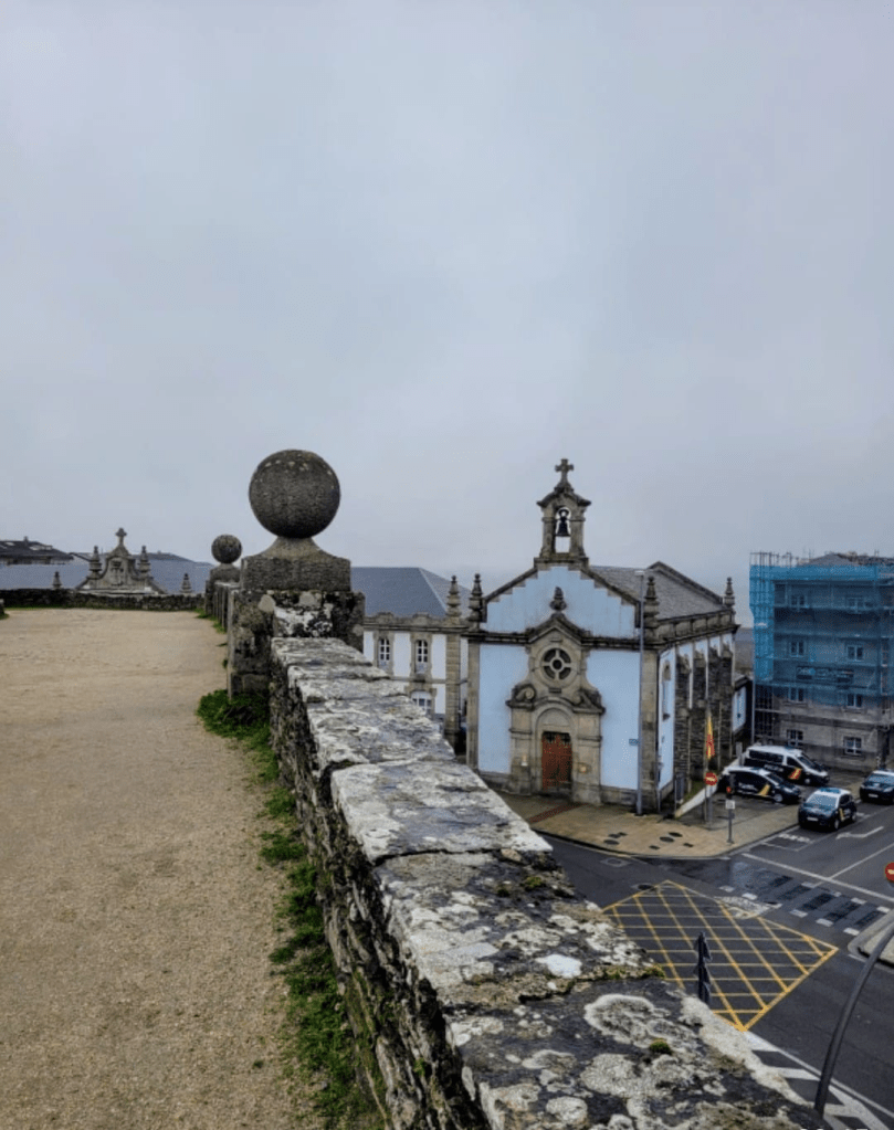 Y seguimos avanzando. Sabemos que la muralla compone un gran rectángulo que se curva en sus extremos. Pero al caminar no percibimos esa figura que muestran los planos. No advertimos pronunciados giros, claras curvas que alteren un trayecto más o menos rectilíneo. Sin embargo, todo el tiempo hemos caminado en un movimiento que nos devuelve al punto de partida, la puerta Miñá, próxima a la Catedral de Lugo.