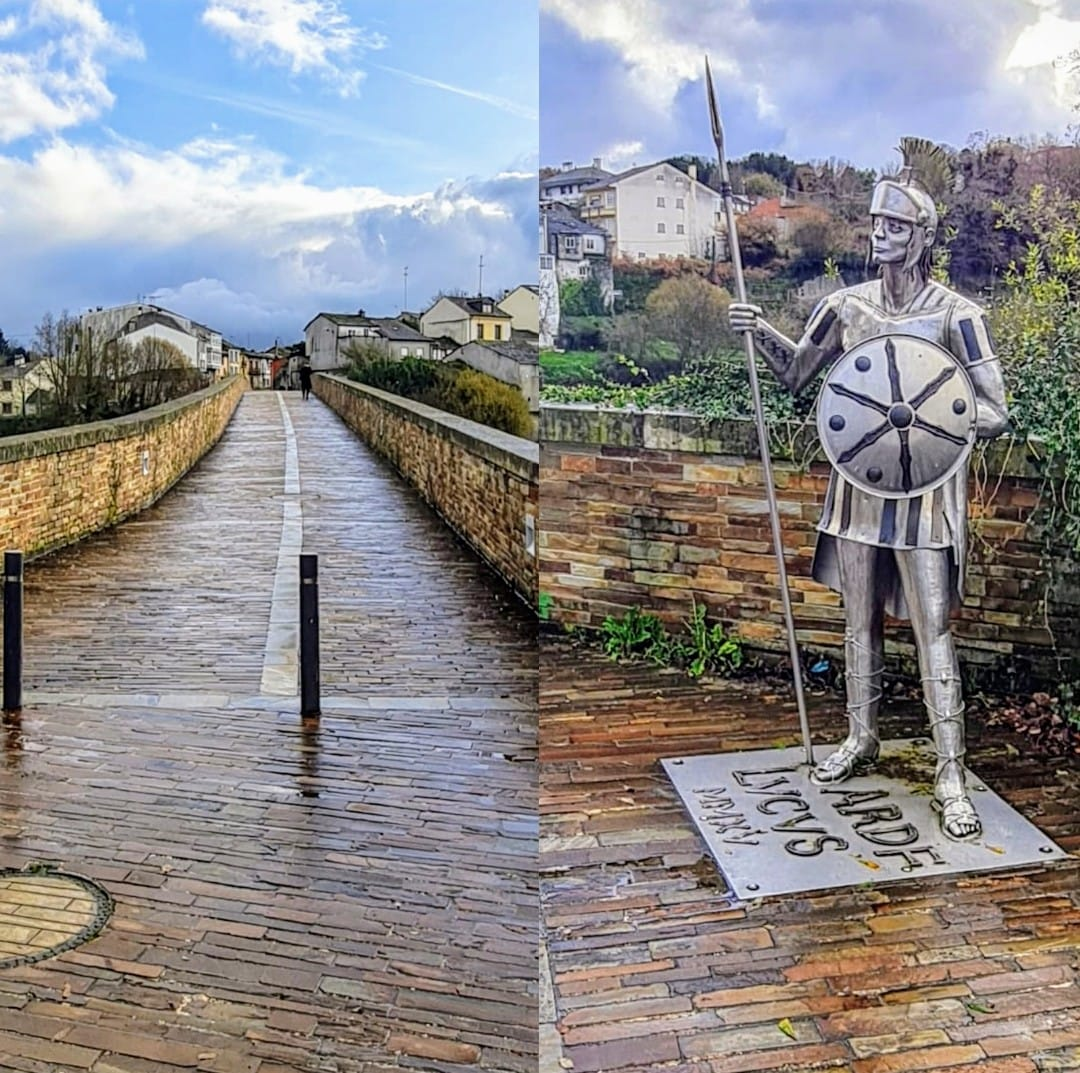 Y desde las inmediaciones de la muralla, vía GPS que Laura usa con mucha habilidad, llegamos hasta la Calzada da Ponte. Con cada paso, la vía se inclina cuesta abajo. Gradualmente, las edificaciones son más rústicas. El piso embaldosado hace olvidar el pasado de pobreza e inundaciones de aquella calle. Finalmente, vemos una simpática estatua de un soldado romano, más parecida a una estampa de comic que a los guerreros de antaño. La figura metálica nos confirma que estamos ante el Puente Romano sobre el río Miño. En sus orígenes se llamó la vía número XIX del Itinerario de Antonio que unía Lucus Augusti con Bracara Augusta ( hoy Braga), e Iliria Flavia (hoy villa de Padrón).