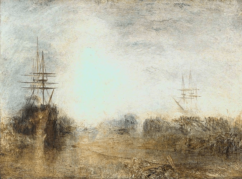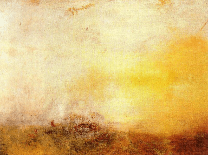 Por eso Turner no es solo “pintor de la luz” sino también transformador de las formas reconocibles, porque en su arte las potencias antes solo exteriores de la naturaleza trascienden hacia lo invisible y sugerido. Por lo difuminado y neblinoso de su pintura, Turner parece llevarnos hacia el trasfondo no directamente visible de la materia misma, hacia la energía que no puede ser contenida ya por líneas rectas y claras. Así su pintura rebasa el naturalismo y lo figurativo, y se acerca a lo abstracto e informal.