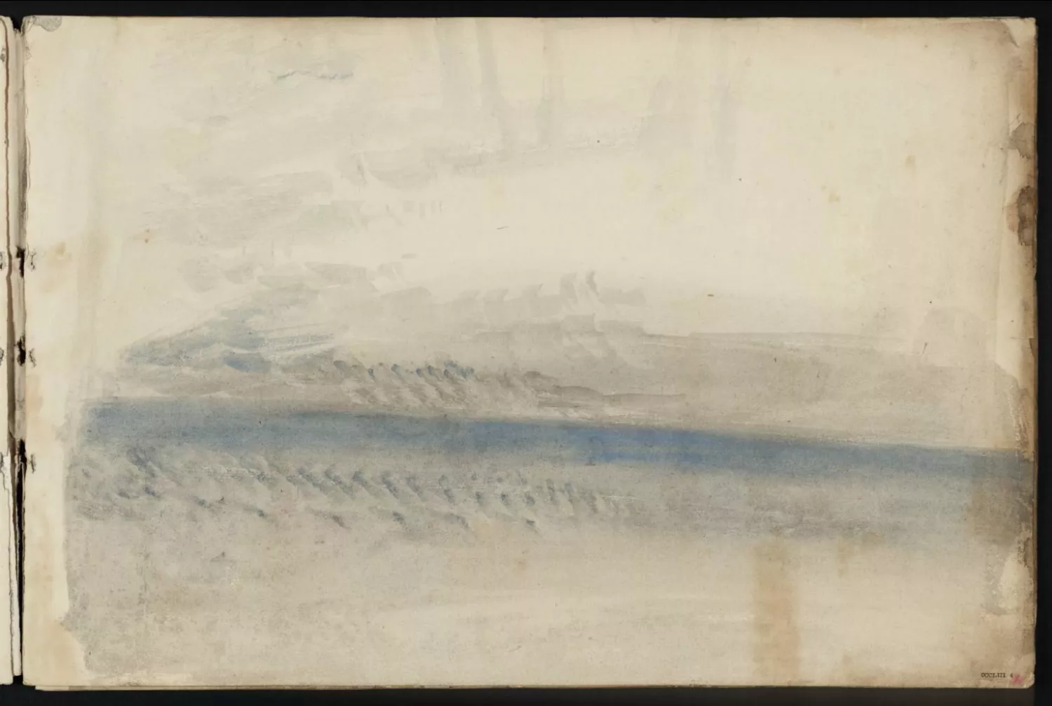 El proceso antes mencionado de gradual desmaterialización en Turner puede observarse en la evolución de sus pinturas del mar. En sus primeros lienzos del siglo XIX, sus imágenes de barcos, naufragios, mar, cielo y olas, se ciñen a un arte figurativo. Pero la nitidez naturalista se desvanece, poco a poco, hasta llegar a lo difuminado, lo desfigurado de remolinos de agua, aire y luz, con un dejo fantasmal, como en las acuarelas con tiza de sus bocetos de Balleneros presentados en la Royal Academy en 1845; y en el mismo año At sea, pintura en la que unas pocas pinceladas, unas líneas y una mancha sugerieren la presencia del mar. Así, desde un minimalismo de elementos compositivos, nuevamente Turner bosqueja un estilo casi abstracto, que también evidencia en muchas de sus pinturas venecianas.
