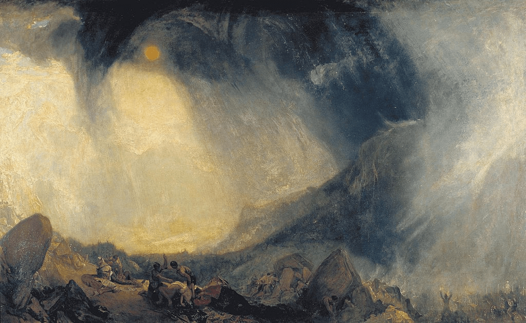 En su cuadro Aníbal atravesando los Alpes (1812) se disuelven los puntos de referencia dados por líneas horizontales, verticales o diagonales, y lo que domina son arcos y conos irregulares de nubes negras que ensombrecen el cielo con un sol crepuscular. Y el ejército de Aníbal fuera del primer plano, en la distancia. En la pintura, los poderes naturales se manifiestan por lo sombrío y caótico.