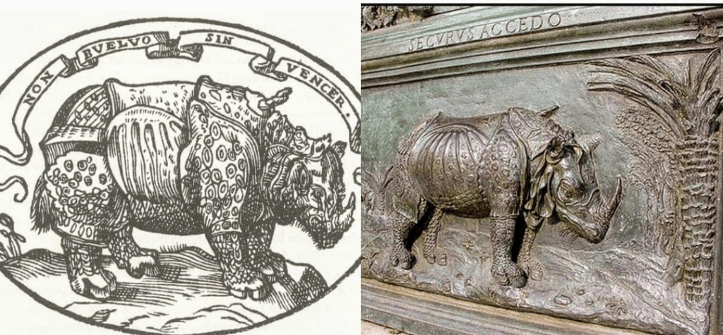 Un rinoceronte en relieve, también con eco del de Durero, decora una de las puertas de bronce de la Catedral del Pisa. El rinoceronte dureriano se convierte también en tema repetido de pinturas y esculturas, y motivo habitual en la decoración de porcelana.