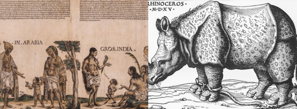 El rinoceronte de Durero no es solo una imperfecta representación artística, no es solo el testimonio de una especie nueva, sino una imagen-puente que desliza la atención hacia otras formas del mundo; la confirmación, por un animal como imagen al principio solo del arte, de la globalización propia del siglo XVI como derrame expansivo del europeo hacia otros continentes: América, África, Asia (la cuna del rinoceronte del grabado); una nueva cartografía planetaria, una extensión de la mente imperial europea hacia la redondez de la tierra.