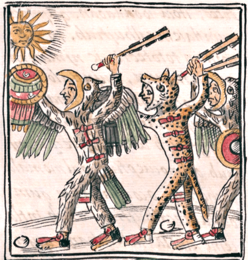 En la mentalidad azteca, el águila era asimismo espíritu afín al jaguar. Ambos eran protectores de las potencias guerreras terrestres. El animal moteado de manchas precedía una de las cofradías secretas de caballería azteca, mientras que la otra era regenteada por el águila. Al mismo tiempo, en el trono ceremonial del monarca azteca, éste se sentaba sobre plumas de águila y disponía sobre su espalda de un retazo de piel de jaguar.