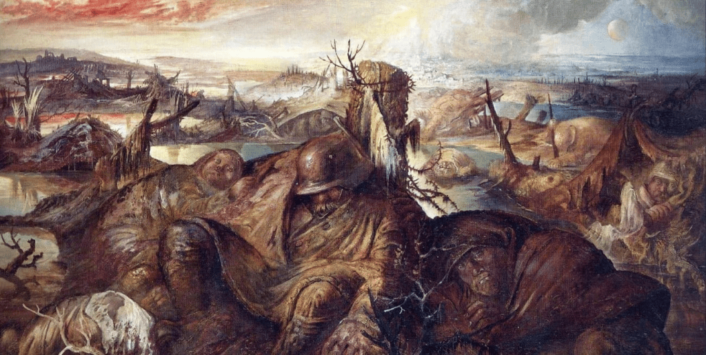 El dramatismo de la guerra inspiró una multitud de novelas, pinturas, grabados y películas a lo largo de la historia. En el arte, sobresalen las pinturas de Otto Dix, combatiente de la Primera Guerra Mundial. En 1923 Dix pinta Trinchera, con su mirada entre estética y sufriente del abismo bélico, y un año después publica los cincuenta grabados de su obra La guerra, casi al mismo tiempo que el foto-libro Guerra a la Guerra, del militante pacifista Ernst Friedrich, quien compiló cientos de fotografías de archivos militares y médicos, con imágenes consideradas impublicables por su horror, para hacer patente la barbarie del caos bélico, en un giro crítico que deconstruye todo resplandor heroico o romanticismo.