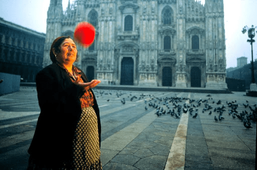 La abuela gitana sabe el secreto de la sangre de la vida roja. Y rojos son los hilos de la esfera que ella sostiene mientras canturrea y camina frente al Duomo. Los hilos recuerdan al tejido, y el tejido nos conduce a las viejas Diosas Hilanderas, aquellas que, lo mismo que la Luna, gobiernan el tiempo, el devenir de la vida universal. Desplegar los hilos es apertura a la universalidad de la vida, a todos los tejidos del mundo.