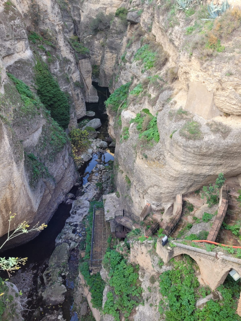 Lo impresionante del puente rondeño no es solo su altura, sino también su mimetización con la roca. Del fondo del río se extrajo el material para la construcción. Por eso el color del puente parece indiscernible de las paredes del acantilado.