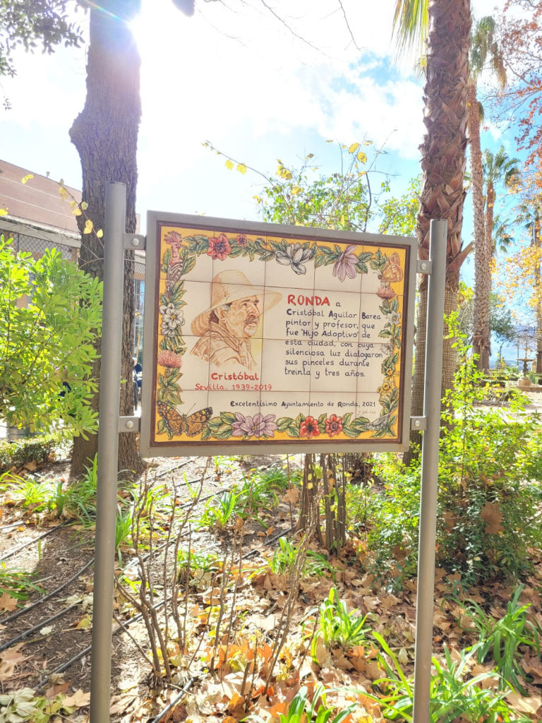 En nuestro primer recorrido, por la Calle Virgen de la Paz arribamos a la Plaza de Toros y el parque Alameda del Tajo. El bello espacio público es un paseo, un mirador del majestuoso panorama circundante, un lugar de reunión de puestos de artesanías, árboles que sirven de asiento de muchos pájaros; y el recuerdo del legado de Cristóbal Aguilar Barea, artista nacido en Sevilla que convirtió a Ronda en su hogar adoptivo.