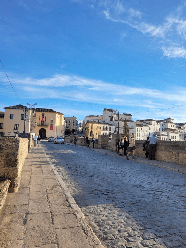 El diálogo con el ingeniero español y el coreano, un posible gerente retirado, dentro del escenario del puente. Y caminamos por las calles de Ronda, por los alrededores de su estación de tren, la Iglesia de Santa Cecilia, donde en el siglo XVII hubo una ermita; en la Plaza del Socorro, en el barrio del Mercadillo, una estatua de Hércules, flanqueado por dos leones, en el lugar donde Blas Infante organizó la primera asamblea andaluza. Y transitamos por la principal calle peatonal: la Calle Espinel, popularmente conocida como «Calle La Bola», que atraviesa el centro histórico. Su nombre proviene de un juego tradicional con bolas de hierro que era practicado en la zona antes de la urbanización. Del otro lado del Puente Nuevo descubrimos el Barrio de San Francisco, en el que se observa la Puerta de Almocábar, la muralla árabe que rodeaba Ronda, modificada en tiempos de Carlos V, y el Convento de San Francisco, con su iglesia, de estilo gótico-mudéjar, y una portada de estilo gótico isabelino; y también deambulamos por la Calle Nueva con establecimientos tradicionales como la Casa Quino, o Bodega El Coto.