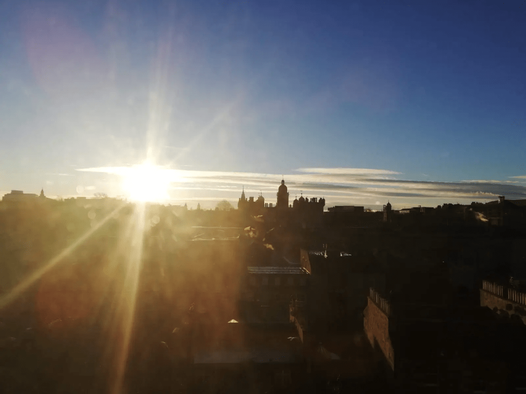 Y recorremos la Ciudad nueva, allí descubrimos una famosa barbería vintage y bar de cócteles «Panda and Sons»; en la noche, observamos el castillo de Edimburgo con sus juegos de luces y música electrónica en una fusión de lo medieval con sonidos de modernidad y vanguardia. Recorremos calles que se alzan sobre otras oficiando de puentes que regalan perspectivas aéreas; vemos la Universidad de Edimburgo, de 1583, las más popular en el Reino Unido luego de las de Oxford y Cambridge; y una biblioteca municipal nos hace recordar el sabor perdido de la lectura; una esquina con una placa en bronce difunde palabras de Stevenson y encontramos muchos pubs y whiskerías con los licores ancestrales escoceses; negocios atrayentes y discretos; el tiempo urbano y sus habitantes que muchas veces se rozan en las calles sin nunca cancelar la distancia infinita que separa a todos los seres. Y en horas avanzadas de una noche, cuando aún falta para la radiación de un nuevo sol, recorremos la ciudad dormida, abrazada por una tenue lluvia y la niebla, y escuchamos el llamado de todos los seres que antes la habitaron, y que lo siguen haciendo, pero en un paralelo reino de lo intangible, y lentamente nos despedimos.