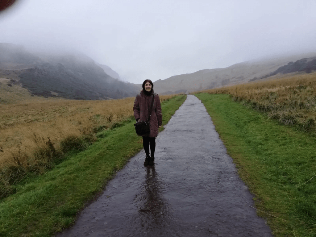 Y la geografía escocesa vibra cerca de Edimburgo. La tarde se impregna de lluvia. Con Laura volvemos hasta el final de la Royal Mile y, a pocos pasos, nos internamos en una camino a través de la tierra entre una atmósfera lluviosa, húmeda, que destila una serena niebla. El entorno se reduce. En el modo neblinoso el espacio se difumina, inocula misterio en cada piedra y humilde retazo de suelo. La realidad flota entre lo sólido y gaseoso, en una frontera salpicada por algo surreal. Avanzamos por un buen tramo, nos elevamos por una cuesta ascendente; vemos, de un lado, en lontananza, a Edimburgo, y hacia adelante el Arthur’s Seat («El asiento de Arturo»), el pico principal de un grupo de colinas que forman la mayor parte de Holyrood Park, el espacio natural que estamos recorriendo, cuyo paisaje es similar a las Highlands.