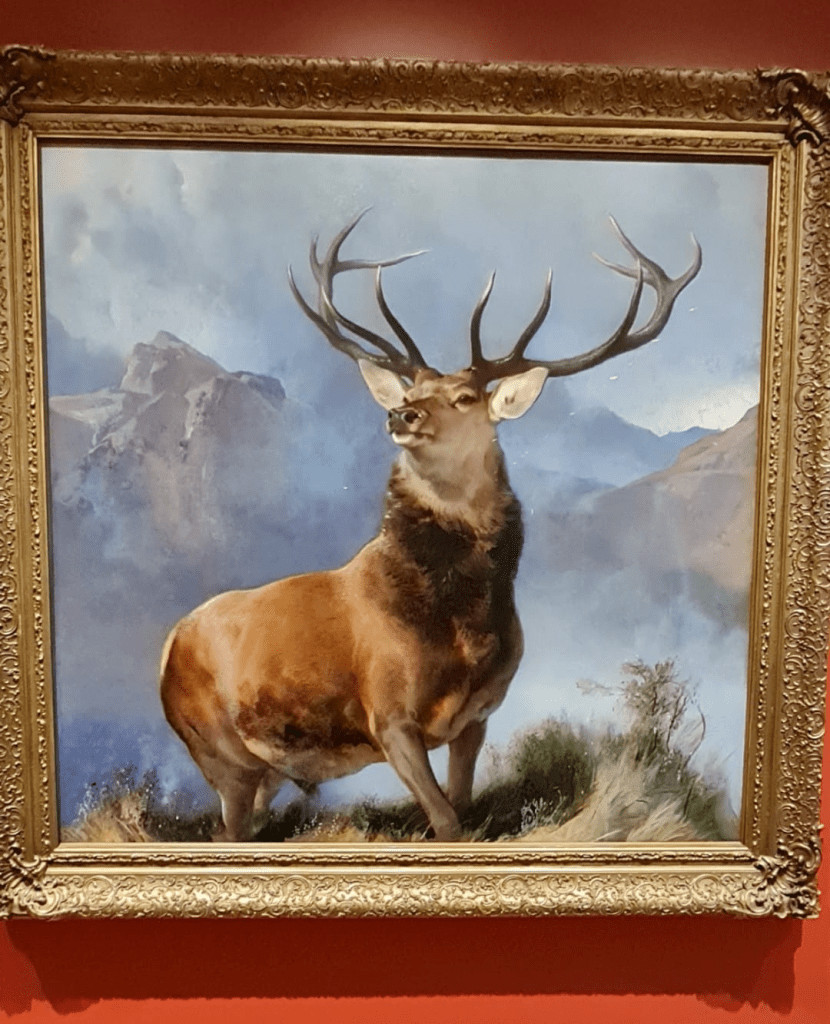En el piso de pintura escocesa, nos detenemos, extasiados, ante El Monarca del Glen (The Monarch of the Glen, 1851), de Sir Edwin Landseer, gran artista creador de figuras animales. Un icono de Escocia, una de las más extraordinarias pinturas del siglo XIX. En la imagen maravillosa, se alza un ciervo, con su cornamenta con puntas de astas firmes, capaz de salvajes arremetidas, en toda su orgullosa presencia. La grandeza de las Tierras Altas y la fauna de Escocia representada en la nobleza sin la oscuridad humana de un noble animal, rey del valle.