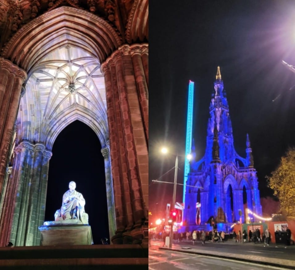 Si se piensa en un escritor que representa a Escocia, este, inevitablemente, es Sir Walter Scott. Cerca de la estación de Waverly, frente a los almacenes Jenners y sobre la avenida Princes Street Gardens, una torre cubierta de tiempo y negrura se alza con firmeza; es el Monumento a Scott, de estilo gótico de corte victoriano, de más de 60 metros de altura, construido en pizarra de Livingston. Una escalera de caracol interna permite subir a lo alto del edificio. La contaminación industrial de la Edimburgo del siglo XIX, la Auld Reekie (o la vieja ciudad humeante, ya comentada) pintó con una capa ennegrecida la edificación.
