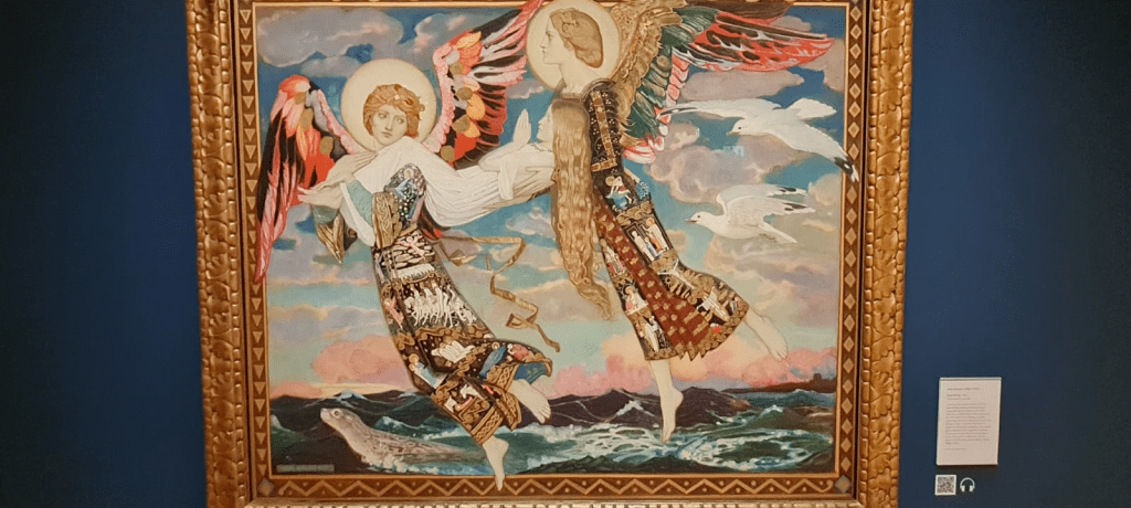 Doblamos y alcanzamos otro pasillo rebosante de arte escocés. Nos atraen muchos artistas y, entre ellos, la obra de John Duncan, La Santa Brígida o Saint Bride (1913), que representa a la santa patrona de Irlanda y su leyenda, en la que dos ángeles la transportan milagrosamente a Belén para el nacimiento de Cristo. A Duncan le fascinaban las Islas Hébridas, Outer Hebrides, con su paisaje marino, detalles, aves y focas, que son parte de la composición de la pintura y, también, en la túnica de uno de los ángeles, incluye una procesión de los Reyes Magos.