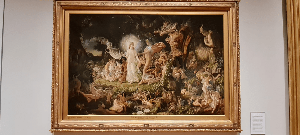 Y avanzamos algo más y nos deslumbra La Disputa de Oberón y Titania (1849), un óleo sobre lienzo del artista escocés Sir Joseph Noel Paton. La escena de la comedia teatral de William Shakespeare, Sueño de una noche de verano. La reina de las hadas, Titania, confronta con Oberón, el rey de las hadas, en la literatura medieval y renacentista. La escena representa el Acto II, en un feérico y encantador paisaje, en la noche, en el bosque, en las afueras de Atenas, rodeados por un grupo de hadas. Lewis Carroll contó 165 seres fantásticos con forma de mujer en la pintura. Hadas, flores, árboles, una estatua de el dios Pan con su flauta, duendes, elfos, diablillos, escarabajos, arañas y caracoles. Un cuadro de rebosante magia y fantasía, el deseo quizá del artista de un mundo menos herido de cinismo y suciedad.