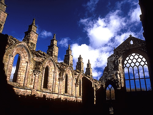 En una ocasión, al deambular sin un rumbo demasiado claro, llegamos hasta el final de la Royal Mile. Allí llegamos al palacio de Holyrood, el principal domicilio de los monarcas de Escocia desde el siglo XVI; actualmente es la residencia oficial de los monarcas británicos en Escocia. Cerca, se esconde las magnéticas ruinas de la Abadía de Holyrood, edificación agustina del año 1128, construida por orden del rey David I de Escocia. Su origen se arraiga en la leyenda: el rey David I sufre un percance al cazar en los bosques. Entonces, lo rescata un ciervo, con una cruz luminosa entre sus cuernos. Por esta mágica ayuda promete construir una abadía en el lugar. Una cruz de oro entre los cuernos de un ciervo conmemora la fundación de la abadía. El clan Crawdford adoptó el lema Tutum Te Robore Reddam que significa «Nuestra fuerza te dará fuerza».