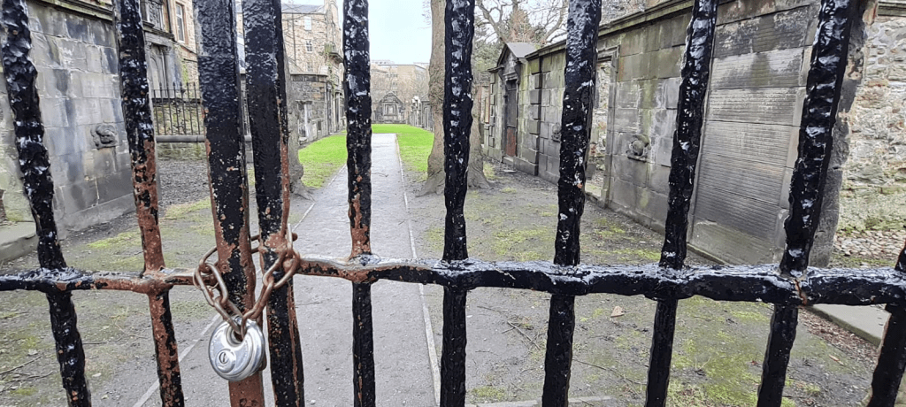 Vemos la iglesia de Greyfriars, que se terminó de construir en 1620. Actualmente es una de las pocas de Escocia donde aún se oficia regularmente misa en gaélico escocés (Gàidhlig). A un costado, en la esquina suroeste del cementerio, nos atrae una reja que bloquea el paso hacia un espacio separado, con compartimientos olvidados, a un lado y otro. Una placa nos pone en conocimiento de que el lúgubre sitio fue prisión de los Covenanters. La palabra escocesa covenant se traduce como “promesa solemne” o “documento legal”. Los Covenanters eran los miembros de un movimiento religioso de raíz presbiteriana, que nació en 1558, y que derramó su influencia hasta el siglo XVII, en Irlanda e Inglaterra.