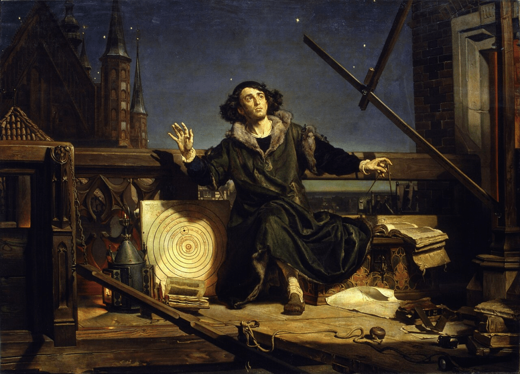 En Cracovia, un sacerdote observa fascinado la noche. Nicolás Copérnico (1473-1543), astrónomo, matemático, físico, jurista, diplomático, economista, sacerdote católico. Oriundo de Torún, norte de Polonia, entre 1506 y 1531, escribe su obra principal De revolutionibus orbium coelestium, en la que enuncia su teoría: los movimientos celestes siguen siendo uniformes, eternos, circulares o en epiciclos, pero en el centro del universo está el Sol. Alrededor del astro rey orbitan Mercurio, Venus, la Tierra, la Luna, Marte, Júpiter, Saturno (Urano, Neptuno, Plutón, serán descubiertos muchos después); las estrellas fijas y distantes giran alrededor del Sol; la Tierra ya es pensada con tres movimientos: rotación diaria, revolución anual, inclinación anual de su eje; la distancia Tierra-Sol es muy pequeña comparada con la distancia a las estrellas.