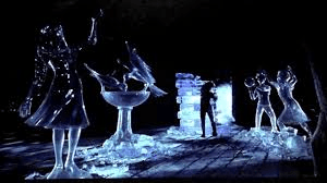 Y la nieve que provoca Edward, en el cuento de hadas burtoniano por excelencia, no es la liberación entonces de lo extraordinario. Es lo que recupera lo que es un atributo esencial de la realidad natural: la creación. En cada nevada, la naturaleza crea millones de copos de estructuras únicas e irrepetibles. La naturaleza crea nuevos días y noches, olas y vientos, seres y lluvias. Edward, el artista de lo natural, construye los jardines de sus esculturas vegetales, o sus obras de hielo. Edward crea como la naturaleza. Pero también la perfecciona. En su trabajo, el joven manos de tijeras libera lo inesencial, lanza al aire los fragmentos de hielo que deben volar para que la forma se muestre pulida. Así surge la primera nieve… Muy cerca de la navidad, la Sra Boggs y Kim se preocupan del armado de un tradicional árbol navideño. Uno de los iconos de la navidad como fiesta repetida, vacía, convencional. Luego, al salir de casa, Kim descubre la forma muy distinta como Edward espera la navidad. Ed esculpe una estatua helada, la estatua de un ser alado, una imagen angélica. Desde el hielo pesado y frío Edward crea una figura espiritual, un ser angélico, celeste, que siempre remite a la luz, lo caluroso y lo leve, lo que es capaz de elevarse y remontarse a lo alto. Y los fragmentos innecesarios de hielo vuelan. Y entonces surge la primera lluvia de los blancos copos.