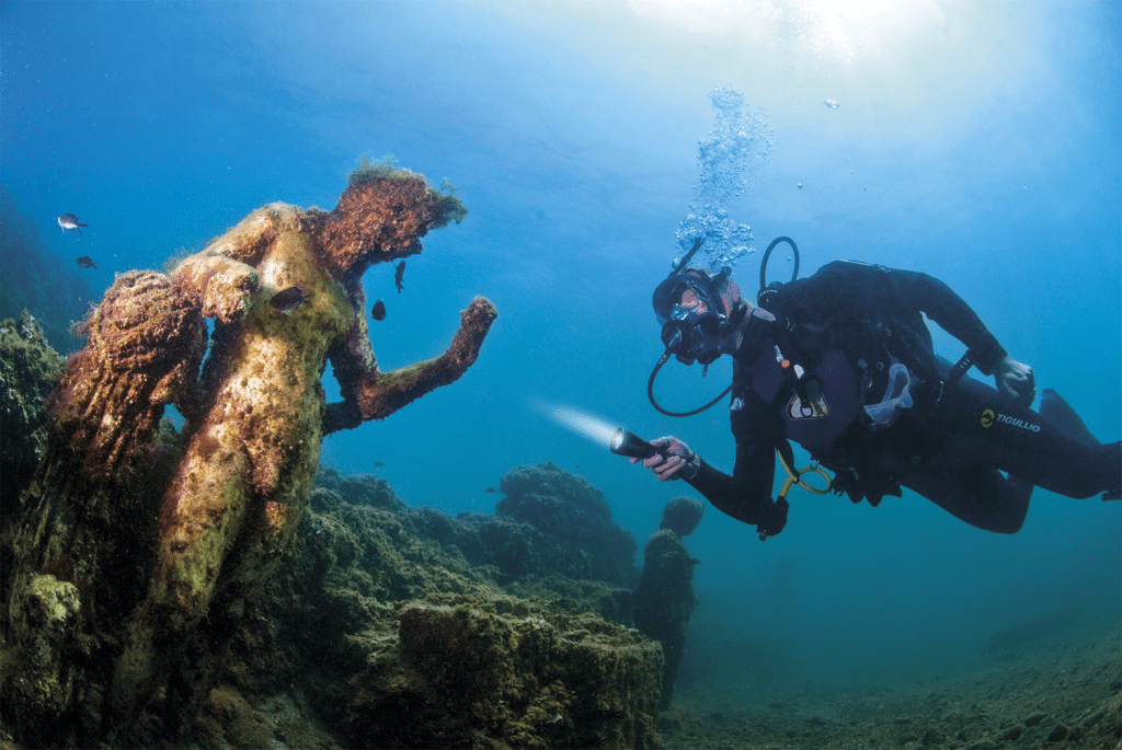 Durante siglos, este “respirar” de la Tierra hizo que las costas se desplazaran, hundiendo poco a poco villas y templos bajo el mar. Hoy, ese proceso ha convertido a Baia en un parque arqueológico submarino único en el mundo, donde todavía se pueden contemplar mosaicos en blanco y negro, esculturas, calzadas, columnas y restos de termas bajo aguas cristalinas.