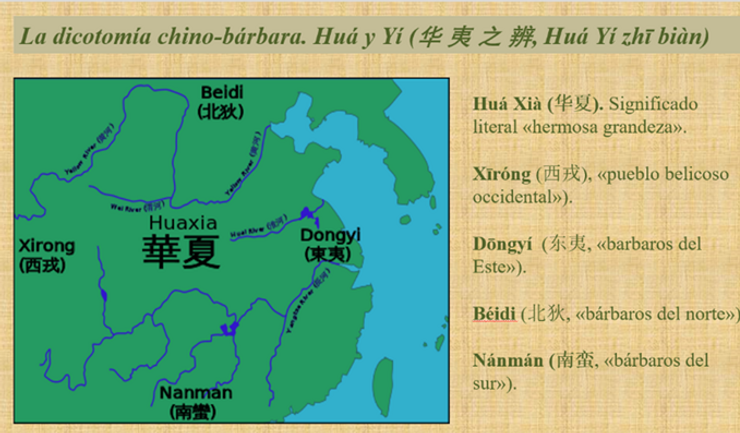 Los Huaxia se referían a sus vecinos como ‘barbaros’ en el doble sentido del término: por ser extranjeros y por su bajo nivel civilizatorio, y no porque los Huaxia se considerarán superiores desde un punto de vista racial o religioso.